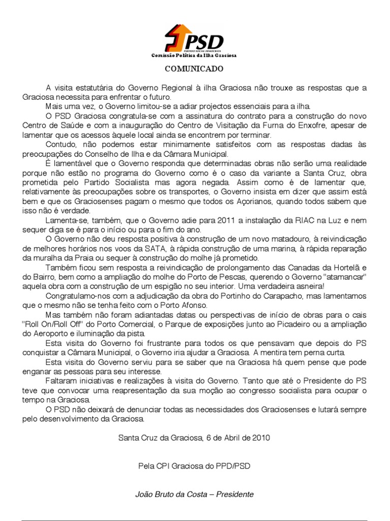 O PSD não deixará de denunciar todas as necessidades dos Graciosenses e lutará sempre
