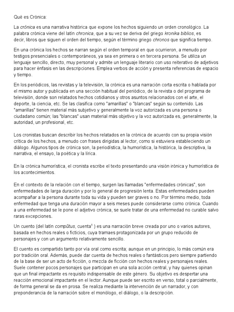 La crnica es una narrativa histrica que expone los hechos siguiendo un orden cronolgico. La