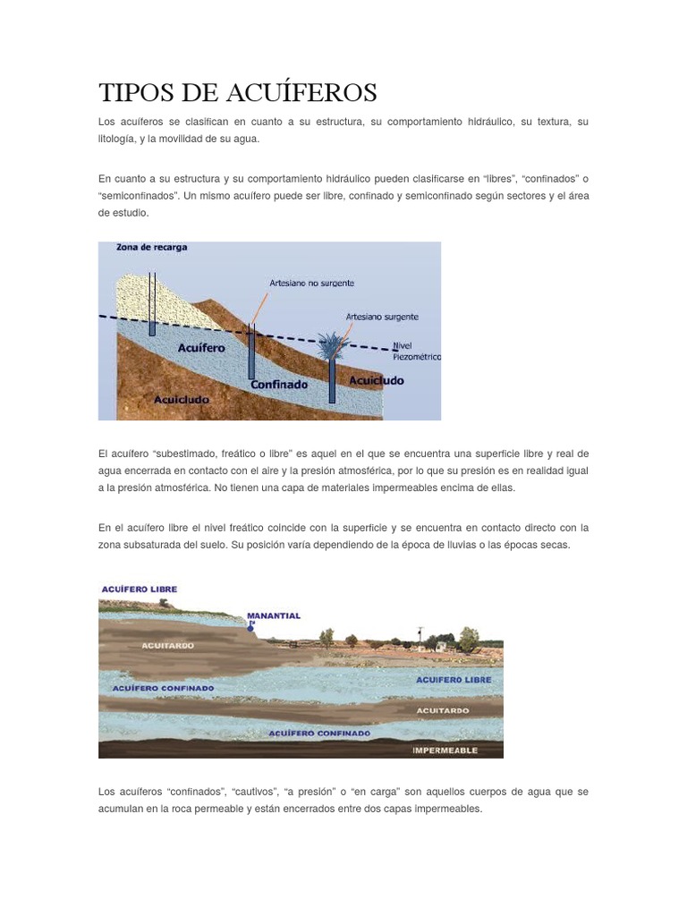 En cuanto a su estructura y su comportamiento hidrulico pueden clasificarse en libres, confinados o