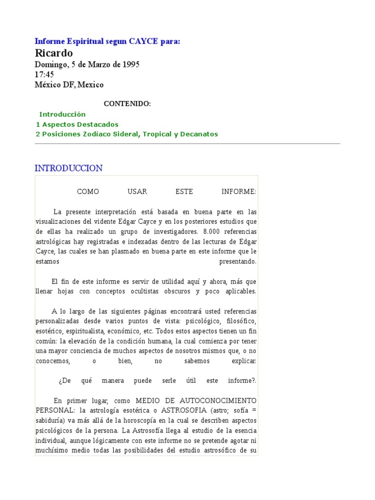 Informe Espiritual segun CAYCE para: