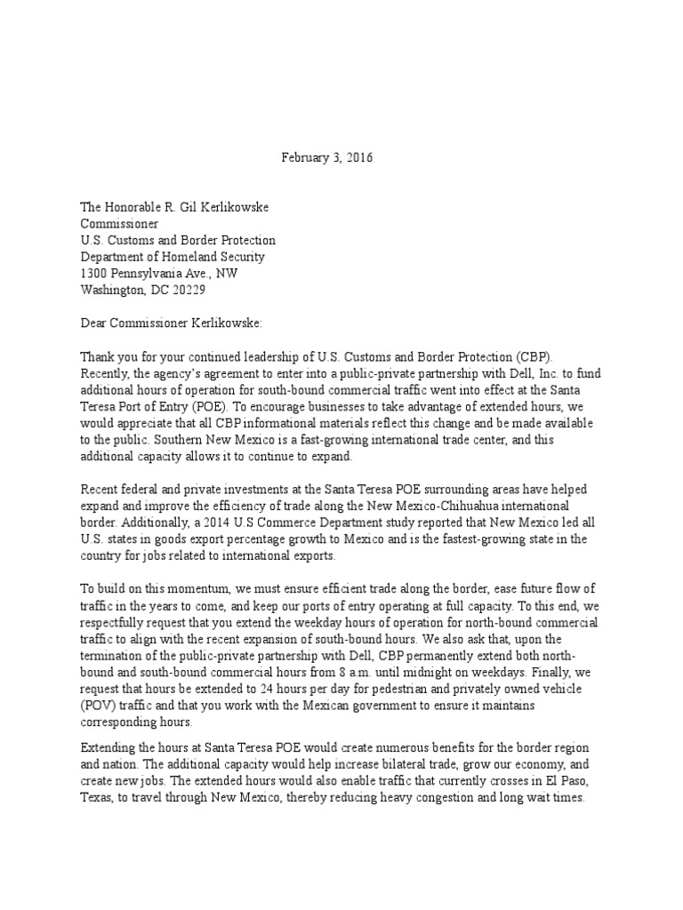 February 3, 2016 The Honorable R. Gil KerlikowskeCommissioner U.. Cus!oms an" #or"er $ro!e%!ion&e'ar!men! o( Homelan" e%uri!y1300 $ennsyl)ania *)e., +ashin-!on, &C 2022 &ear Commissioner Kerlikowske/ Thank you (or your %on!inue" lea"ershi' o( U.. Cus!oms an" #or"er $ro!e%!ion C#$. Re%en!ly, !he a-en%ys a-reemen! !o en!er in!o a 'ubli%'ri)a!e 'ar!nershi' wi!h &ell, 4n%. !o (un"a""i!ional hours o( o'era!ion (or sou!hboun" %ommer%ial !ra((i% wen! in!o e((e%! a! !he an!a Teresa $or! o( 5n!ry $5. To en%oura-e businesses !o !ake a")an!a-e o( e7!en"e" hours, we woul" a''re%ia!e !ha! all C#$ in(orma!ional ma!erials re(le%! !his %han-e an" be ma"e a)ailable !o !he 'ubli%. ou!hern +ew 8e7i%o is a (as!-rowin- in!erna!ional !ra"e %en!er, an" !his a""i!ional %a'a%i!y allows i! !o %on!inue !o e7'an". Re%en! (e"eral an" 'ri)a!e in)es!men!s a! !he an!a Teresa $5 surroun"in- areas ha)e hel'e" e7'an" an" im'ro)e !he e((i%ien%y o( !ra"e alon- !he +ew 8e7i%oChihuahua in!erna!ional bor"er. *""i!ionally, a 2019 U. Commer%e &e'ar!men! s!u"y re'or!e" !ha! +ew 8e7i%o le" all U.. s!a!es in -oo"s e7'or! 'er%en!a-e -row!h !o 8e7i%o an" is !he (as!es!-rowin- s!a!e in !he %oun!ry (or :obs rela!e" !o in!erna!ional e7'or!s. To buil" on !his momen!um, we mus! ensure e((i%ien! !ra"e alon- !he bor"er, ease (u!ure (low o( !ra((i% in !he years !o %ome, an" kee' our 'or!s o( en!ry o'era!in- a! (ull %a'a%i!y. To !his en", weres'e%!(ully re;ues! !ha! you e7!en" !he week"ay hours o( o'era!ion (or nor!hboun" %ommer%ial !ra((i% !o ali-n wi!h !he re%en! e7'ansion o( sou!hboun" hours. e also ask !ha!, u'on !he !ermina!ion o( !he 'ubli%'ri)a!e 'ar!nershi' wi!h &ell, C#$ 'ermanen!ly e7!en" bo!h nor!h boun" an" sou!hboun" %ommer%ial hours (rom < a.m. un!il mi"ni-h! on week"ays. Finally, we re;ues! !ha! hours be e7!en"e" !o 29 hours 'er "ay (or 'e"es!rian an" 'ri)a!ely owne" )ehi%le $= !ra((i% an" !ha! you work wi!h !he 8e7i%an -o)ernmen! !o ensure i! main!ains %orres'on"in- hours. 57!en"in- !he hours a! an!a Teresa $5 woul" %rea!e numerous bene(i!s (or !he bor"er re-ion an" na!ion. The a""i!ional %a'a%i!y woul" hel' in%rease bila!eral !ra"e, -row our e%onomy, an" %rea!e new :obs. The e7!en"e" hours woul" also enable !ra((i% !ha! %urren!ly %rosses in 5l $aso, Te7as, !o !ra)el !hrou-h +ew 8e7i%o, !hereby re"u%in- hea)y %on-es!ion an" lon- wai! !imes.