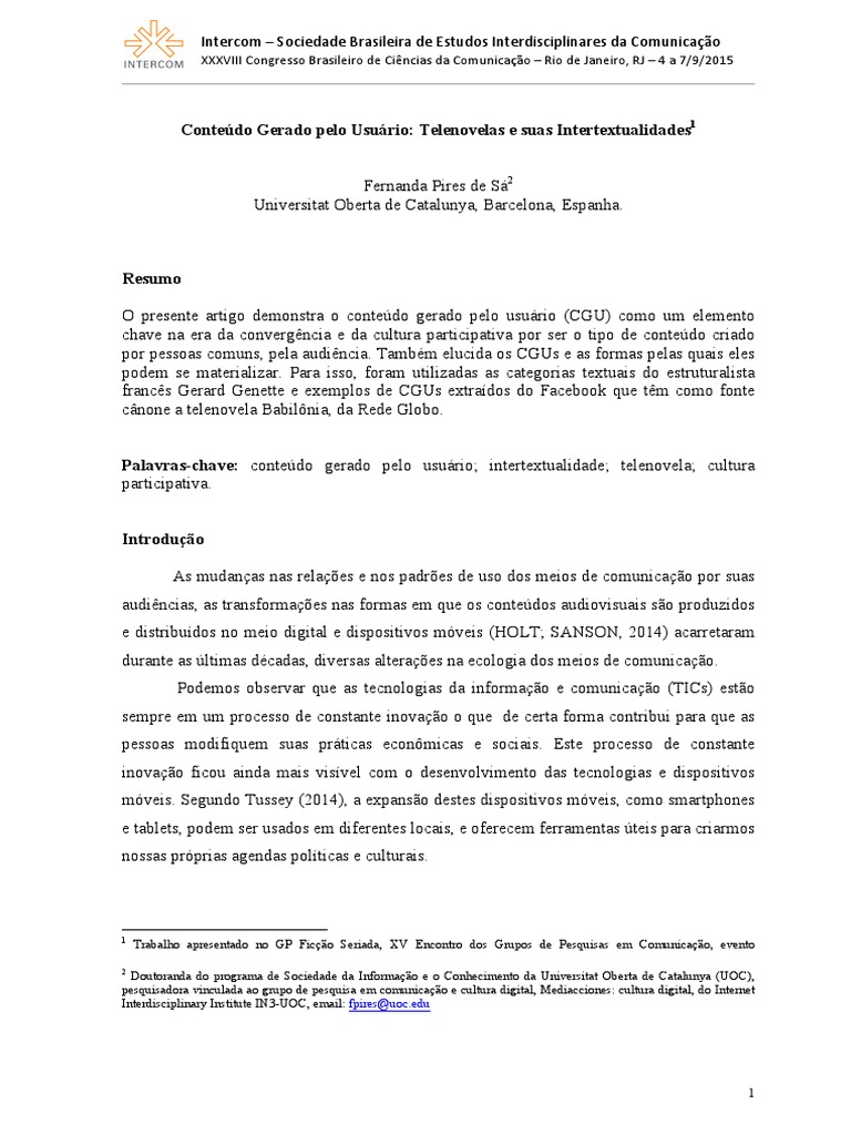Palavras-chave: contedo gerado pelo usurio; intertextualidade; telenovela; cultura