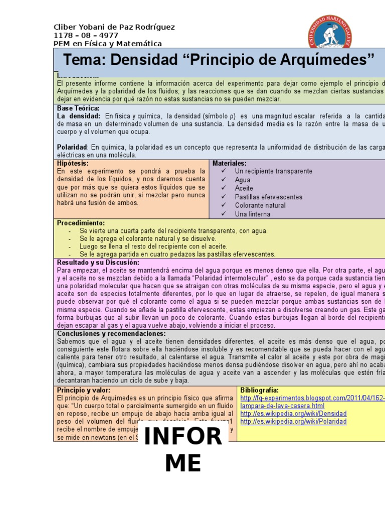 El presente informe contiene la informacin acerca del experimento para dejar como ejemplo el principio d
