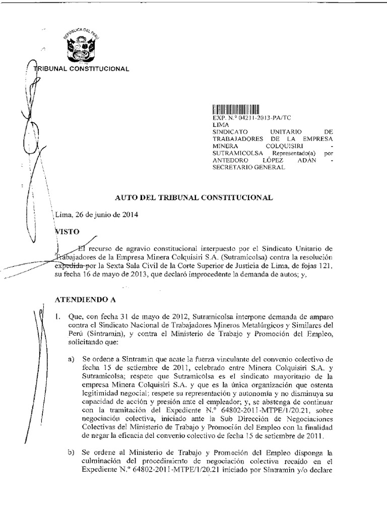 ajadores de la Empresa Minera Colquisiri S.A. (Sutramicolsa) contra la resolucin