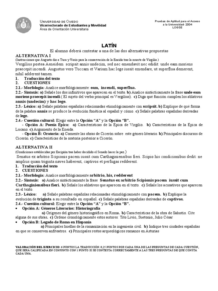 VALORACIN DEL EJERCICIO: 6 PUNTOS LA TRADUCCIN. 0,25 PUNTOS POR CADA UNA DE LAS PREGUNTAS DE CADA CUESTIN,