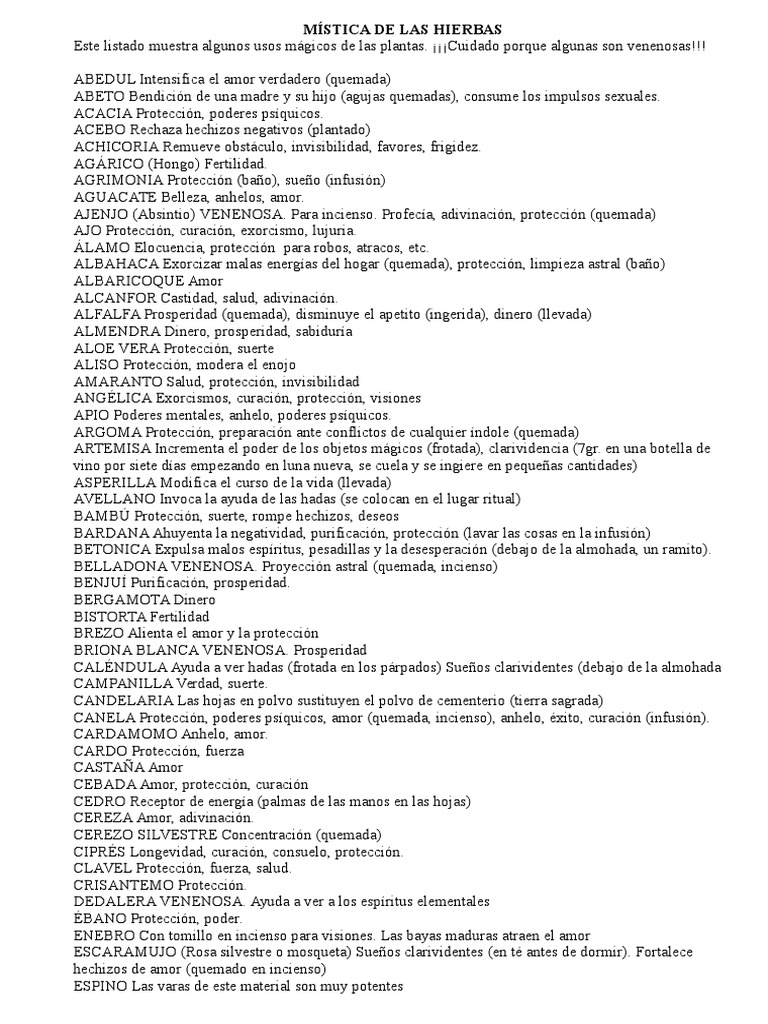 Este listado muestra algunos usos mgicos de las plantas. Cuidado porque algunas son venenosas!!!