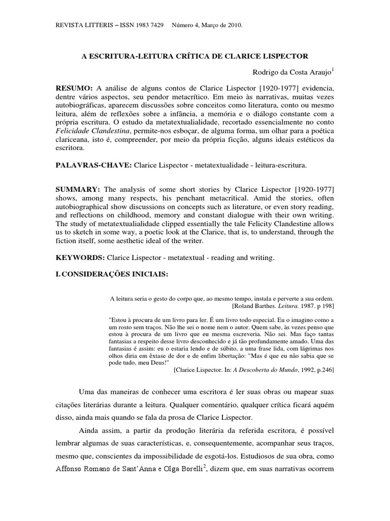 vida e mais um conto seu, intitulado Felicidade Clandestina; [...] Tanto a crnica quanto o conto, o