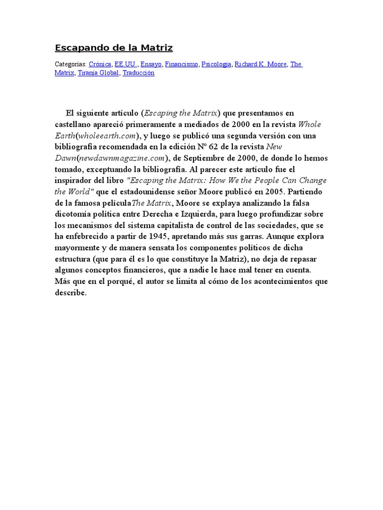El siguiente artculo (Escaping the Matrix) que presentamos en