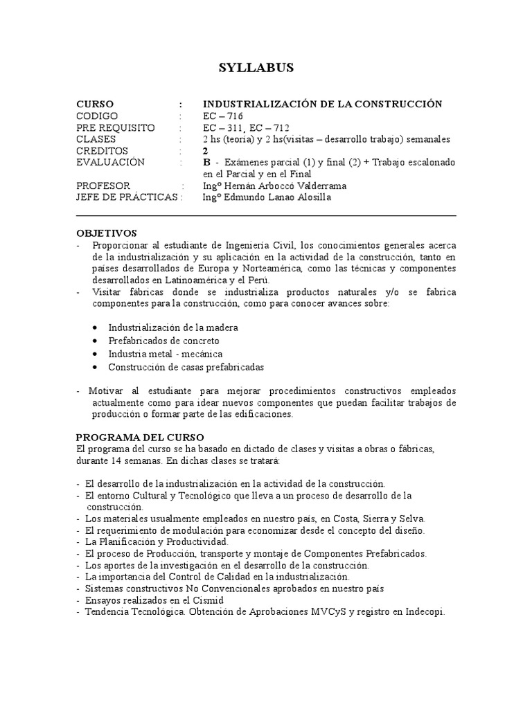 El programa del curso se ha basado en dictado de clases y visitas a obras o fbricas,