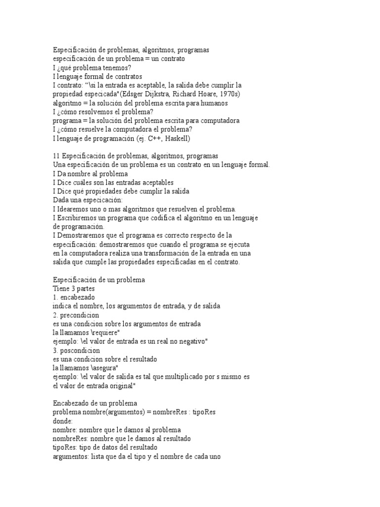 Una especificacin de un problema es un contrato en un lenguaje formal.