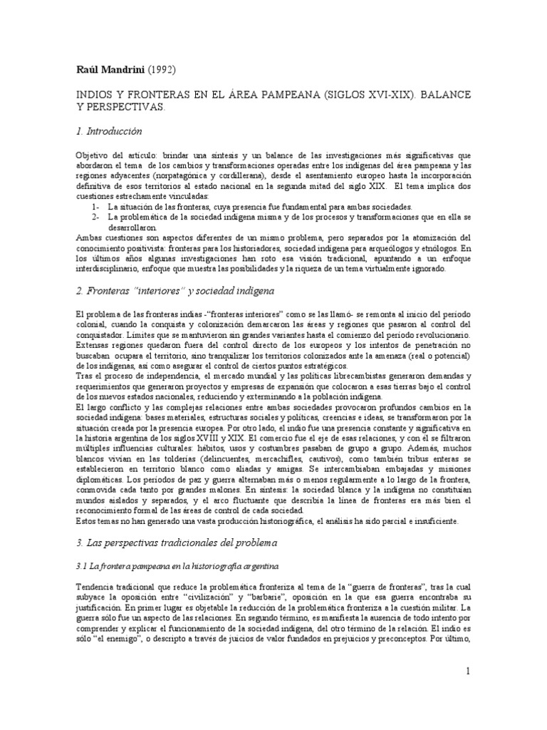 [Raúl Mandrini, “Indios y fronteras en el área pampeana (siglos XVI-XIX). Balance y perspectivas” en