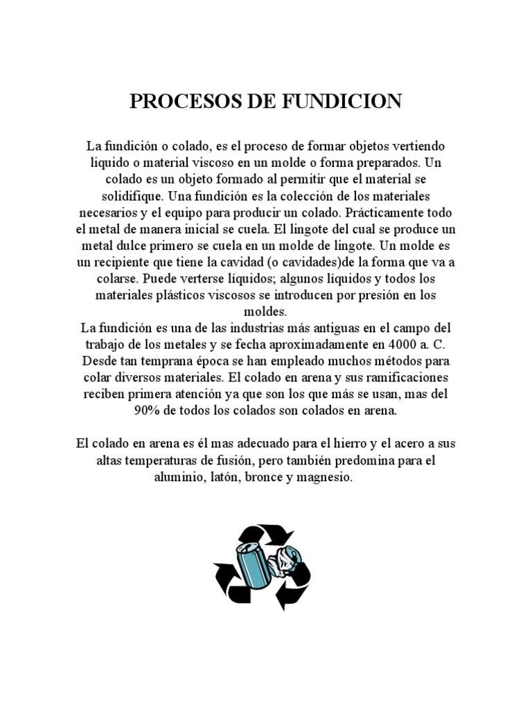 La fundicin o colado, es el proceso de formar objetos vertiendo