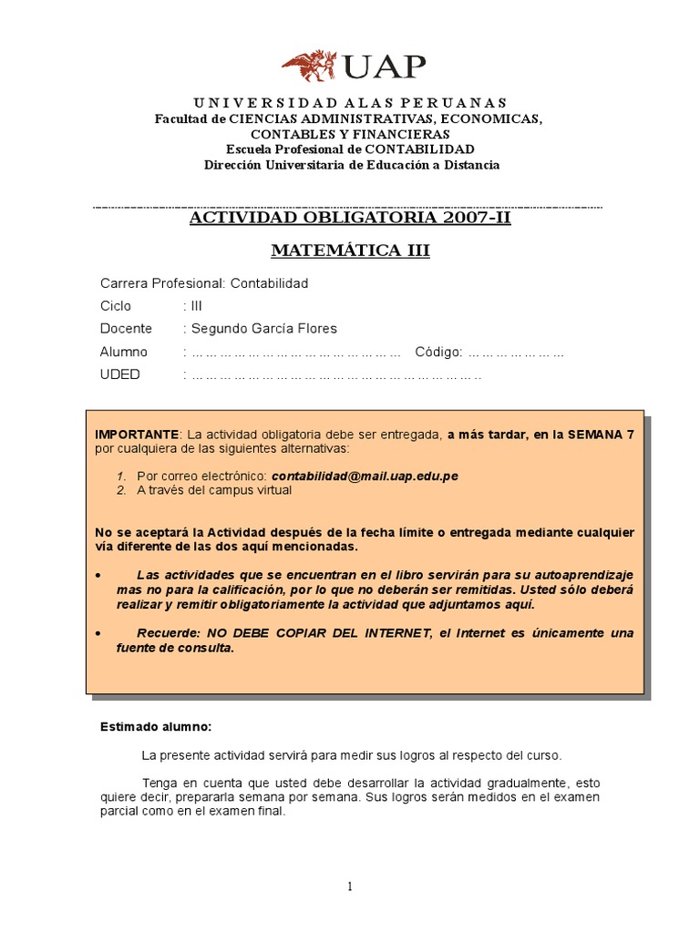 IMPORTANTE: La actividad obligatoria debe ser entregada, a ms tardar, en la SEMANA 7