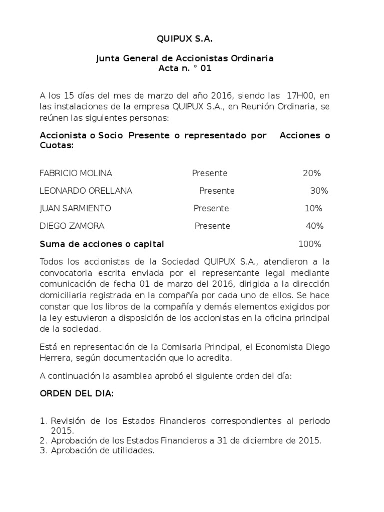 Todos los accionistas de la Sociedad QUIPUX S.A., atendieron a la