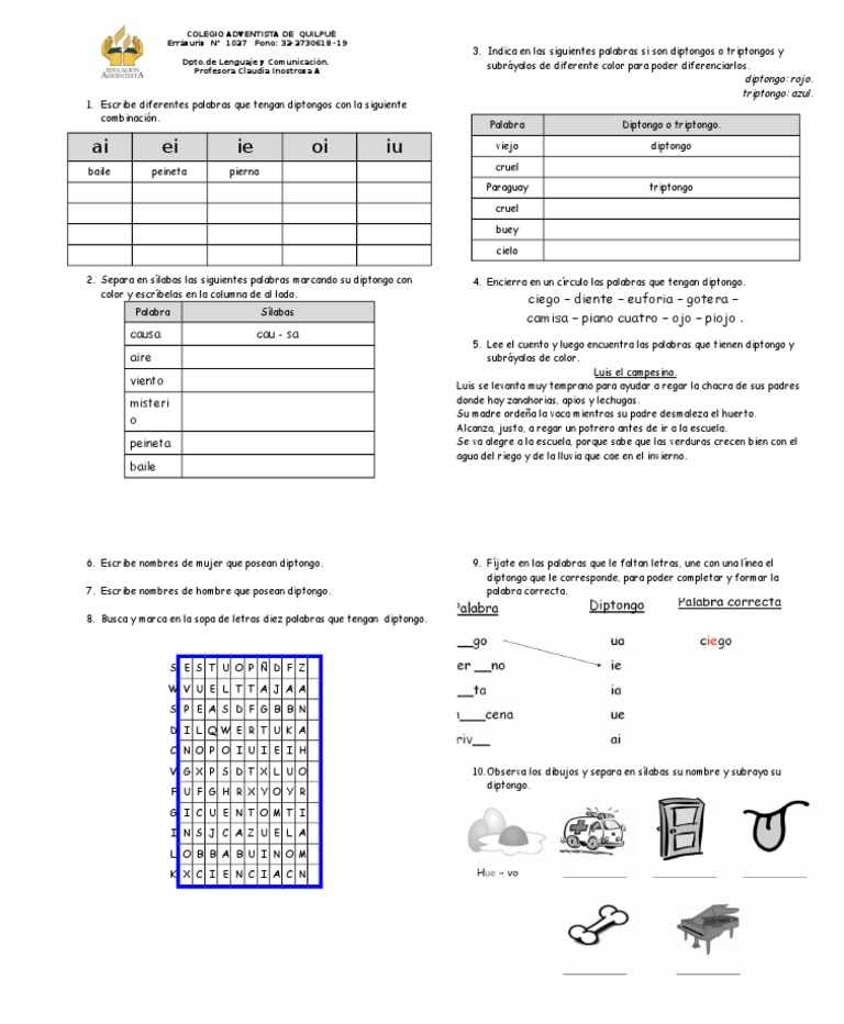 1. Escribe diferentes palabras que tengan diptongos con la siguiente