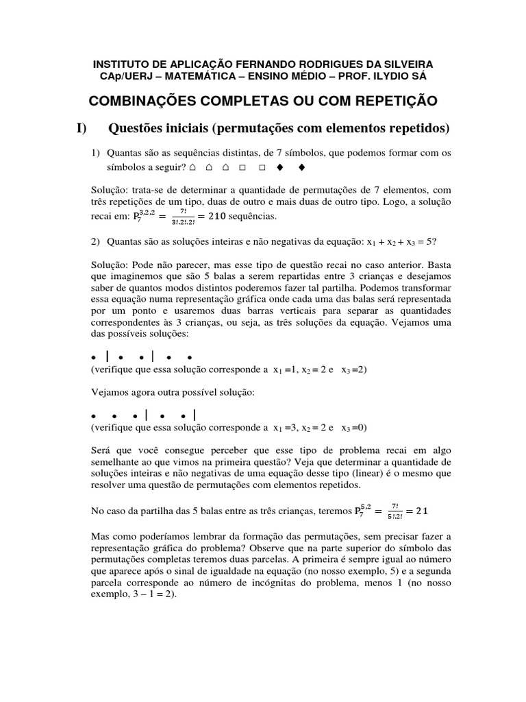 Podemos então concluir, sobre as combinações completas de n elementos, p a p.