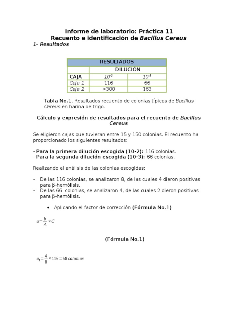 - Para la primera dilucin escogida (10-2): 116 colonias.