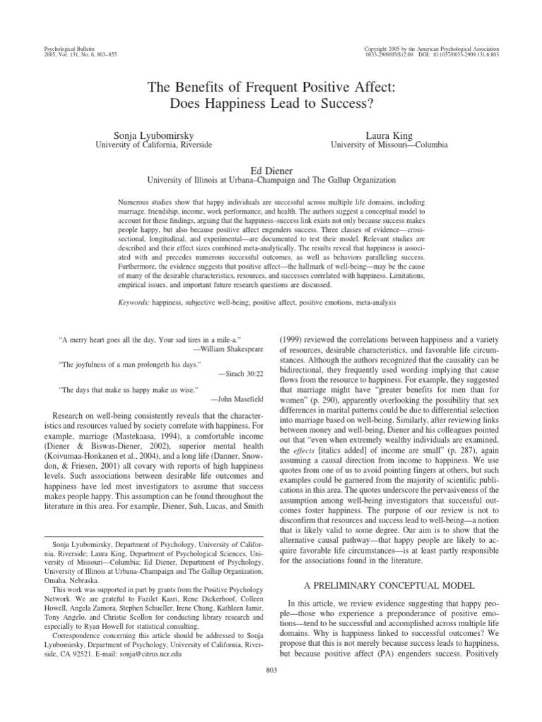 people happy, but also because positive affect engenders success. Three classes of evidence crosssectional, longitudinal, and experimentalare documented to test their model. Relevant studies are