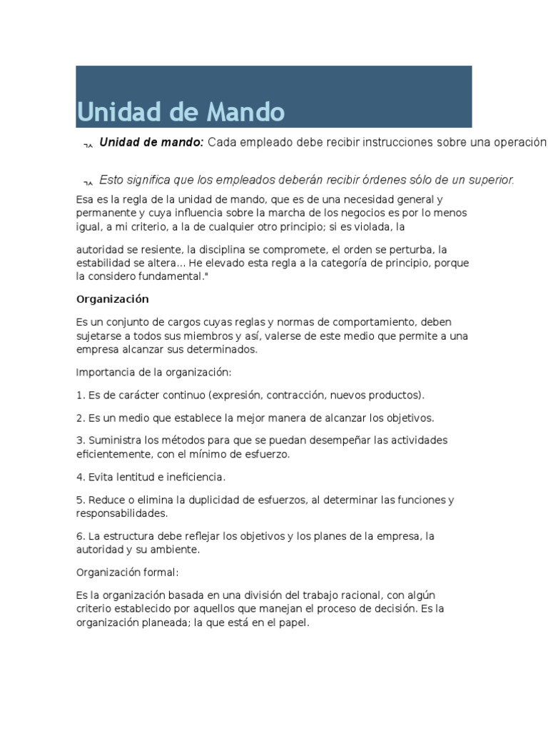 Unidad de mando: Cada empleado debe recibir instrucciones sobre una operacin