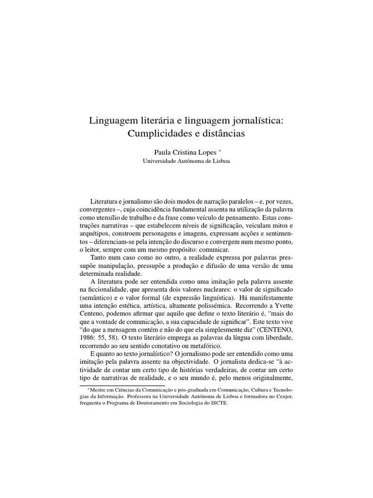 Literatura e jornalismo são dois modos de narração paralelos – e, por vezes, convergentes –, cuja coincidência fundamental assenta na utilização da palavra como utensílio de trabalho e da frase como veículo de pensamento. Estas cons- truções narrativas – que estabelecem níveis de significação, veiculam mitos e arquétipos, constroem personagens e imagens, expressam acções e sentimen- tos – diferenciam-se pela intenção do discurso e convergem num mesmo ponto, o leitor, sempre com um mesmo propósito: comunicar. Tanto num caso como no outro, a realidade expressa por palavras pres- supõe manipulação, pressupõe a produção e difusão de uma versão de uma determinada realidade. A literatura pode ser entendida como uma imitação pela palavra assente na ficcionalidade, que apresenta dois valores nucleares: o valor de significado (semântico) e o valor formal (de expressão linguística). Há manifestamente uma intenção estética, artística, altamente polissémica. Recorrendo a Yvette Centeno, podemos afirmar que aquilo que define o texto literário é, “mais do que a vontade de comunicação, a sua capacidade de significar”. Este texto vive “do que a mensagem contém e não do que ela simplesmente diz” (CENTENO, 1986: 55, 58). O texto literário emprega as palavras da língua com liberdade, recorrendo ao seu sentido conotativo ou metafórico. E quanto ao texto jornalístico? O jornalismo pode ser entendido como uma imitação pela palavra assente na objectividade. O jornalista dedica-se “à ac- tividade de contar um certo tipo de histórias verdadeiras, de contar um certo tipo de narrativas de realidade, e o seu mundo é, pelo menos originalmente,