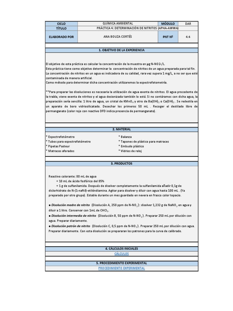 Esta prctica tiene como objetivo determinar la concentracin de nitritos de un agua preparada para tal fin.