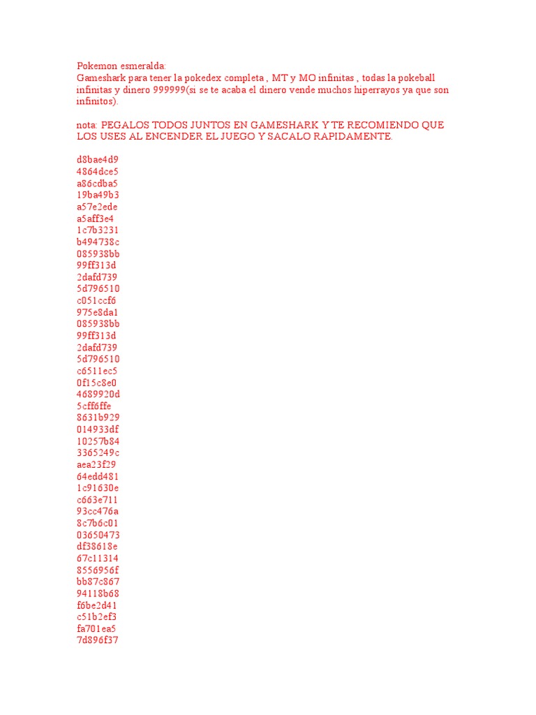 estos son algunos gamesharks para el esmeralda espaol: