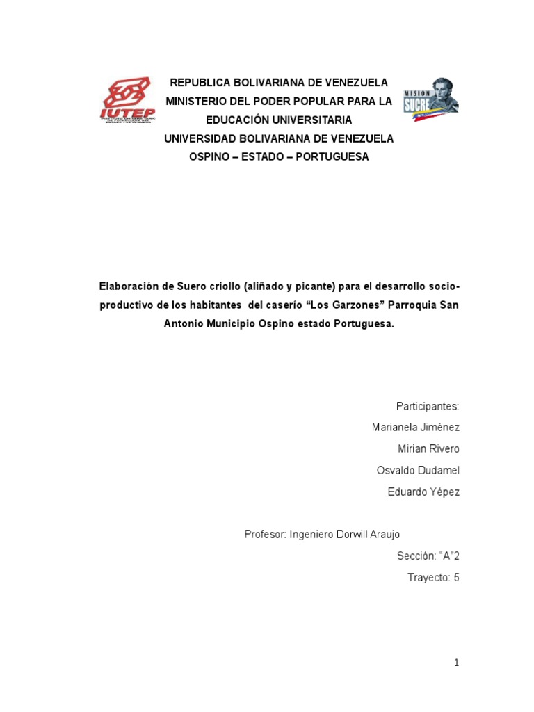 Elaboracin de Suero criollo (aliado y picante) para el desarrollo socioproductivo de los habitantes del casero Los Garzones Parroquia San