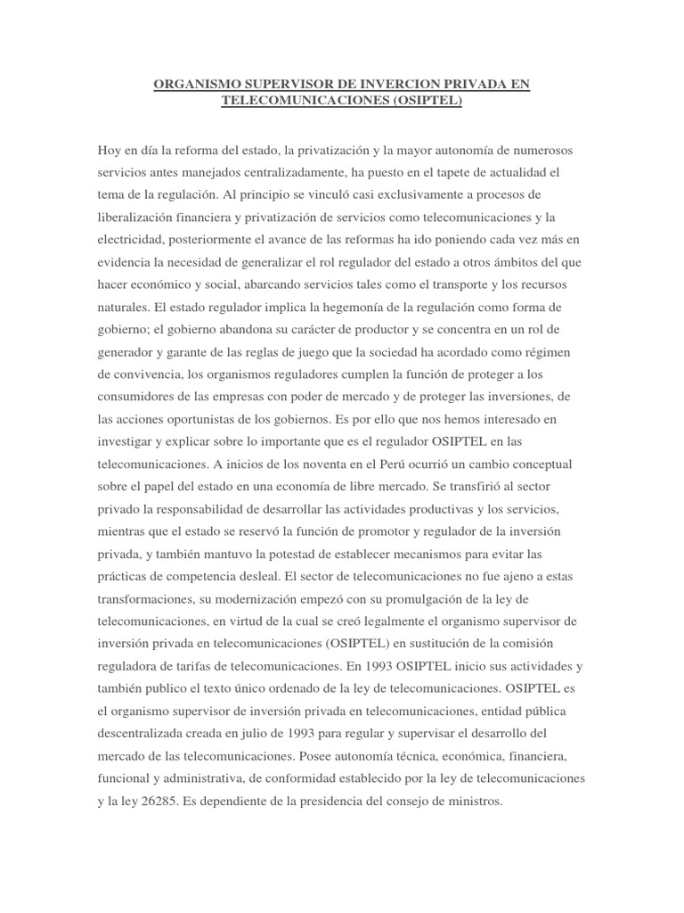investigar y explicar sobre lo importante que es el regulador OSIPTEL en las