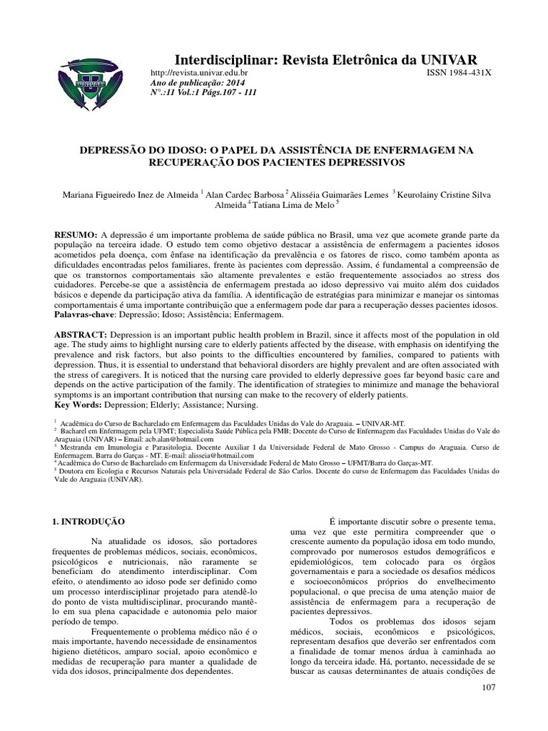 Palavras-chave: Depresso; Idoso; Assistncia; Enfermagem.