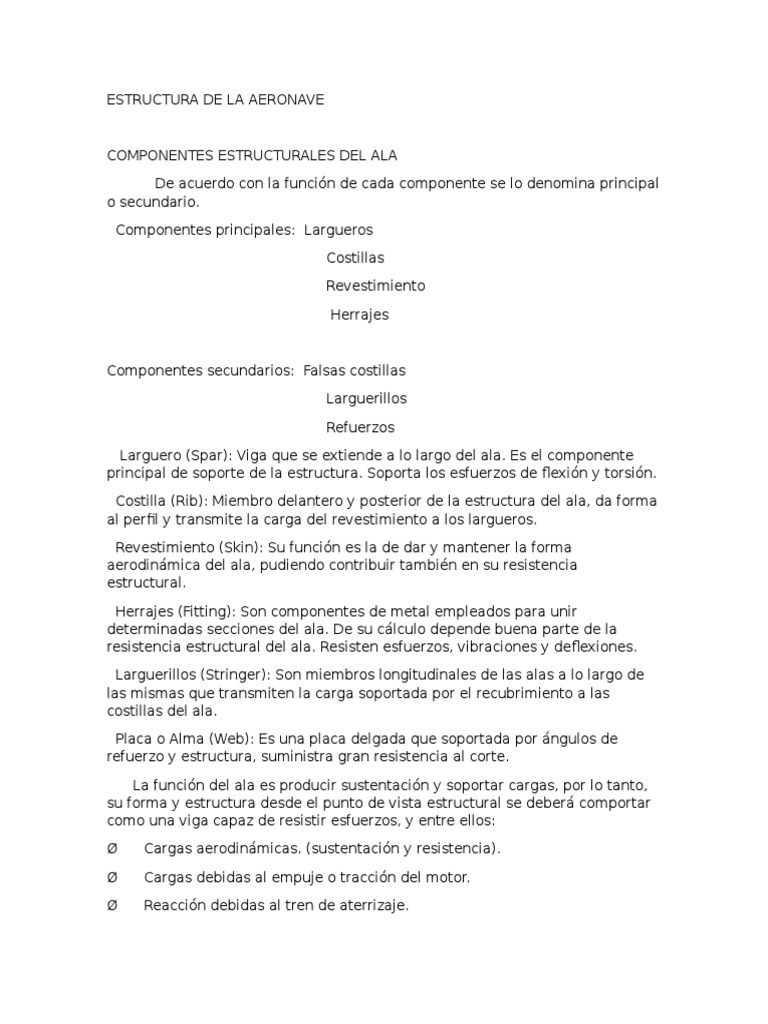 La funcin del ala es producir sustentacin y soportar cargas, por lo tanto,