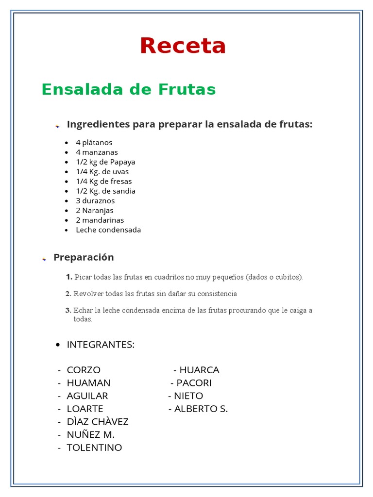 1. Picar todas las frutas en cuadritos no muy pequeos (dados o cubitos).