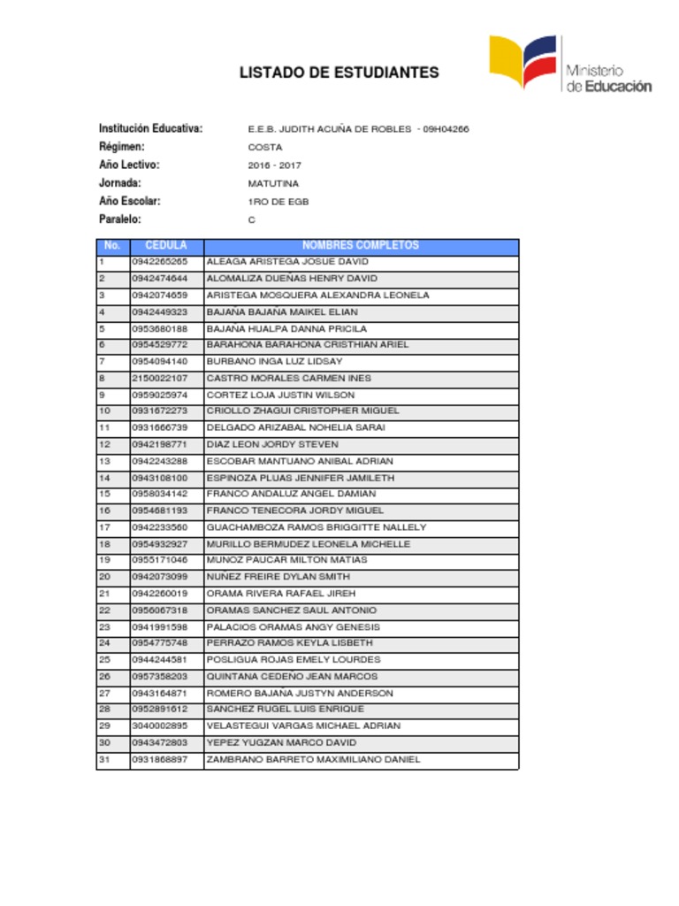 Este documento presenta un listado de 31 estudiantes matriculados en el primer año de educación general básica, paralelo C, de la institución educativa E.E.B. JUDITH ACUÑA DE ROBLES durante el año lectivo 2016-2017. El listado incluye el nombre completo, número de cédula y número de cada estudiante.
