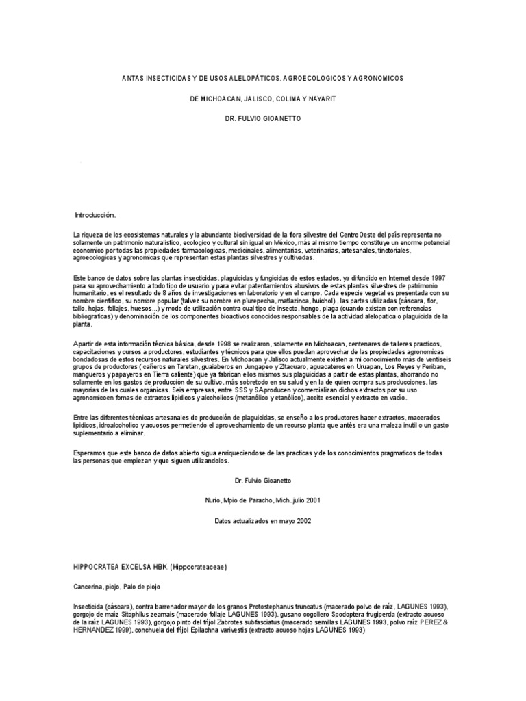 Este banco de datos sobre las plantas insecticidas, plaguicidas y fungicidas de estos estados, ya difundido en Internet desde 1997
