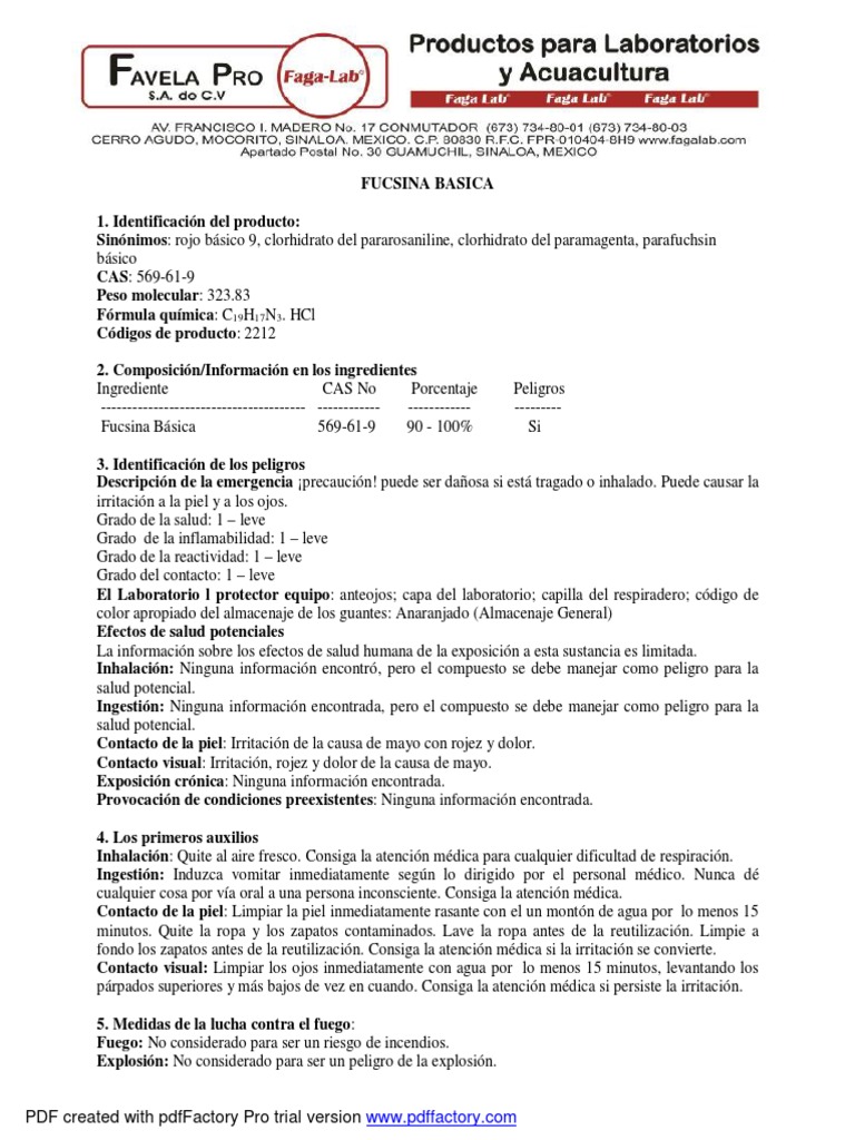 Sinnimos: rojo bsico 9, clorhidrato del pararosaniline, clorhidrato del paramagenta, parafuchsin