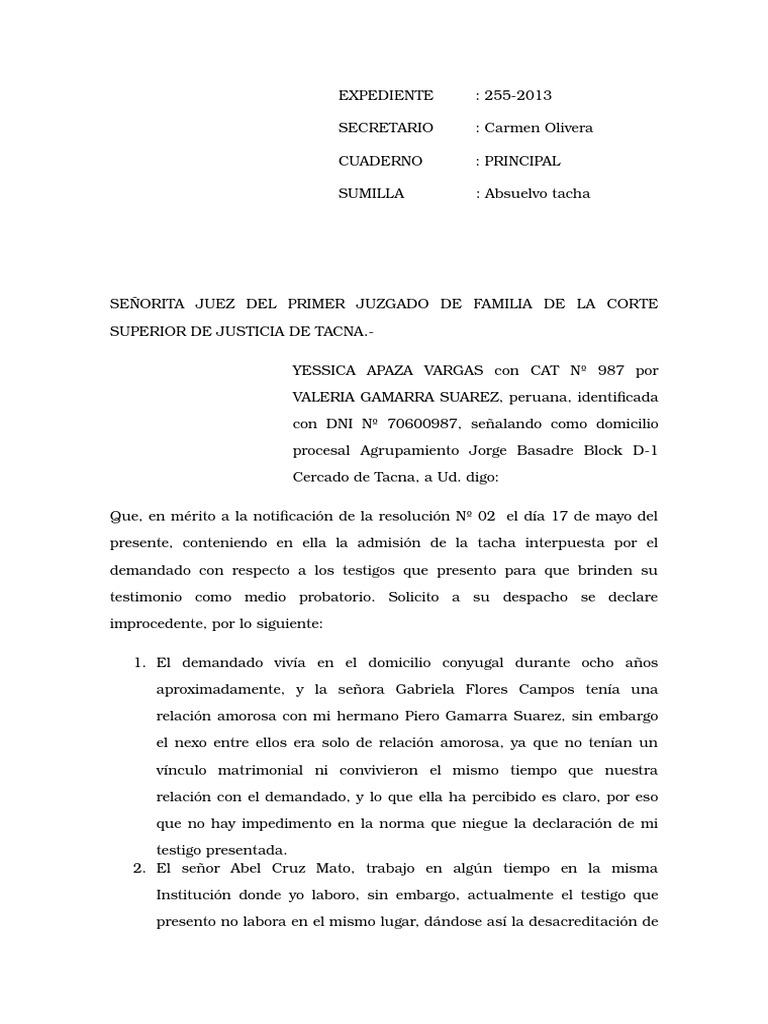 presente, conteniendo en ella la admisin de la tacha interpuesta por el
