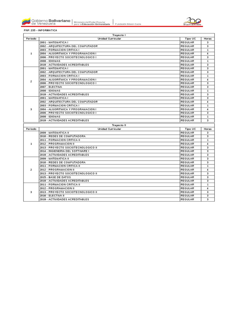 Este documento presenta el plan de estudios de la carrera de Informática dividido en dos trayectos. El primer trayecto cubre las unidades curriculares de matemáticas, arquitectura de computadoras, algoritmia y programación, proyectos sociotecnológicos e idiomas durante los primeros tres períodos. El segundo trayecto incluye matemáticas avanzadas, redes, bases de datos, programación, proyectos e ingeniería de software en los siguientes tres períodos. Todas las unidades curriculares son regulares y tienen entre 1 y