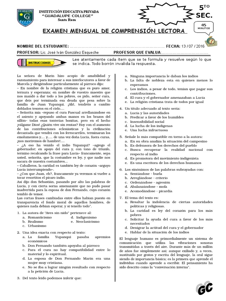 EXAMEN MENSUAL DE COMPRENSIN LECTORA