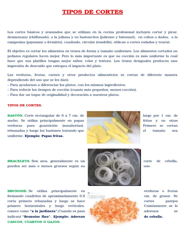 Los cortes bsicos y avanzados que se utilizan en la cocina profesional incluyen cortar y picar,