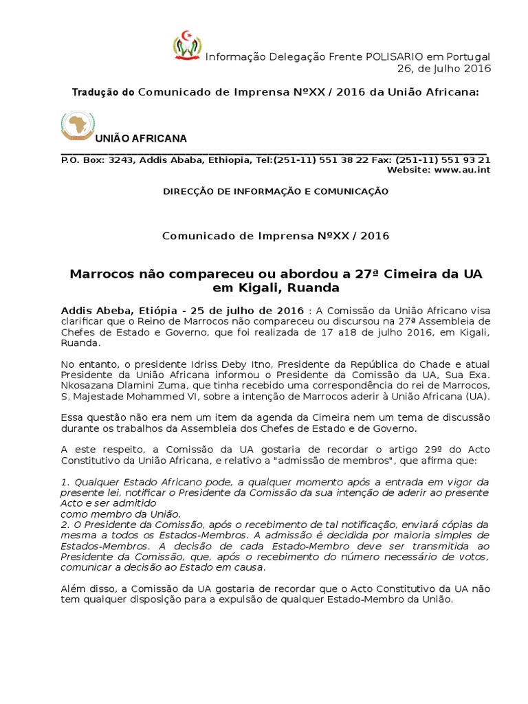 Traduo do Comunicado de Imprensa NXX / 2016 da Unio Africana: