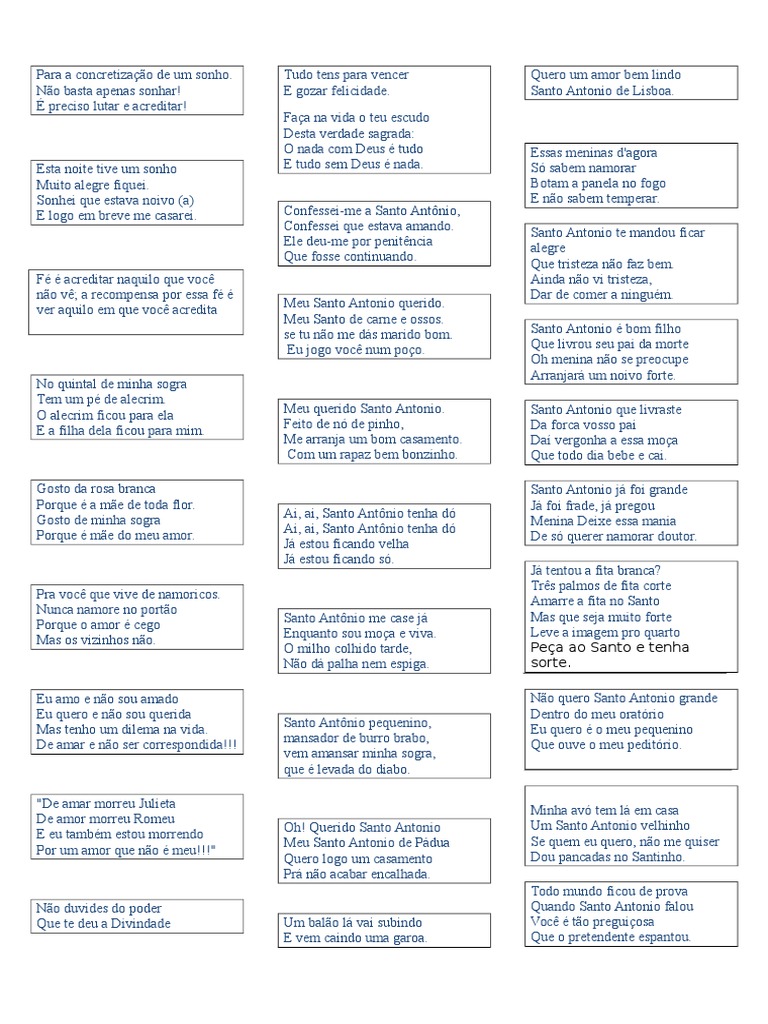 S sabem namorar Botam a panela no fogo E no sabem temperar. Santo Antonio te mandou ficar alegre Que tristeza no faz bem. Ainda no vi tristeza, Dar de comer a ningum. Santo Antonio bom filho Que livrou seu pai da morte Oh menina no se preocupe Arranjar um noivo forte. Santo Antonio que livraste Da forca vosso pai Da vergonha a essa moa Que todo dia bebe e cai. Santo Antonio j foi grande J foi frade, j pregou Menina Deixe essa mania De s querer namorar doutor. J tentou a fita branca? Trs palmos de fita corte Amarre a fita no Santo Mas que seja muito forte Leve a imagem pro quarto Pea ao Santo e tenha sorte. No quero Santo Antonio grande Dentro do meu oratrio Eu quero o meu pequenino Que ouve o meu peditrio.