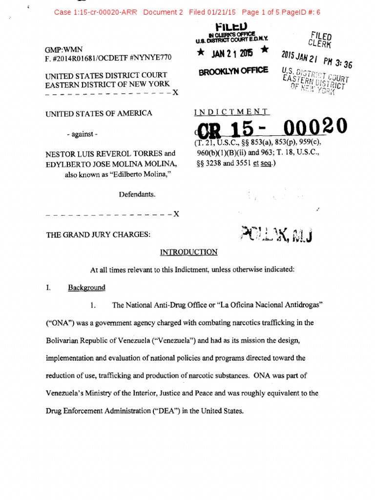 Indictment in United States District Court for the Eastern District of New York charging Nestor Luis Reverol Torres, the former General Director of Venezuela’s La Oficina Nacional Antidrogas (ONA) and former commander of Venezuela’s National Guard, and Edylberto Jose Molina Molina, the former Sub-Director of ONA and currently Venezuela’s military attaché to Germany with drug trafficking