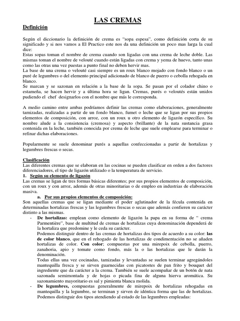 Las diferentes cremas que se elaboran en las cocinas se pueden clasificar en orden a dos factores