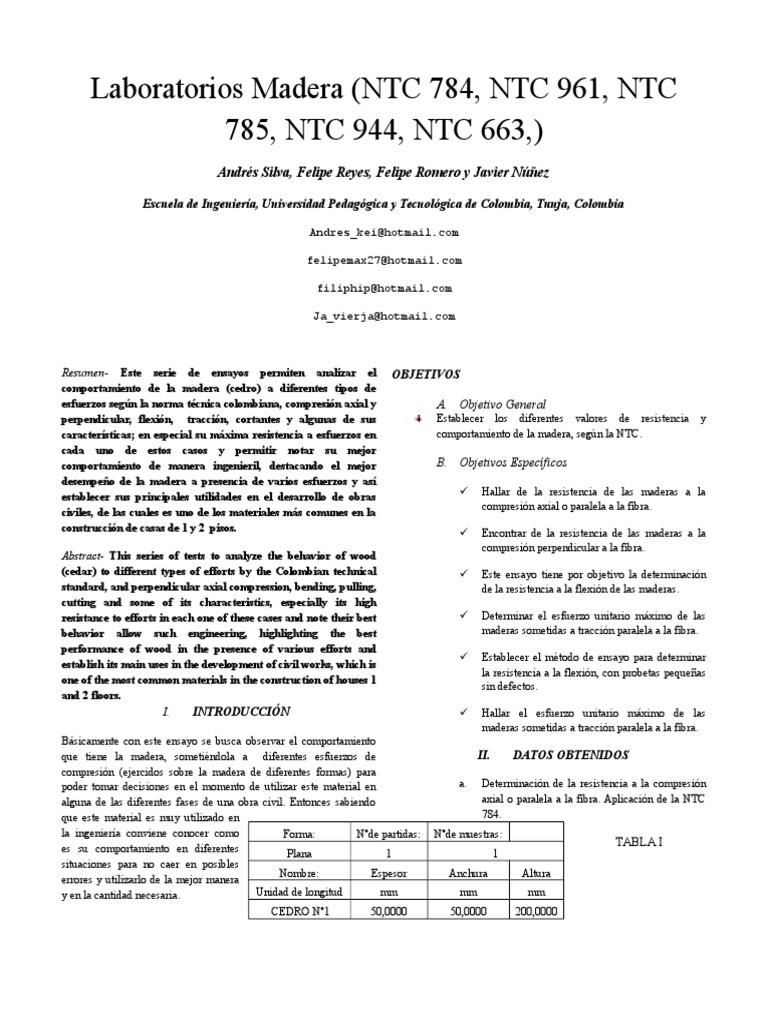 Laboratorios Madera (NTC 784, NTC 961, NTC
