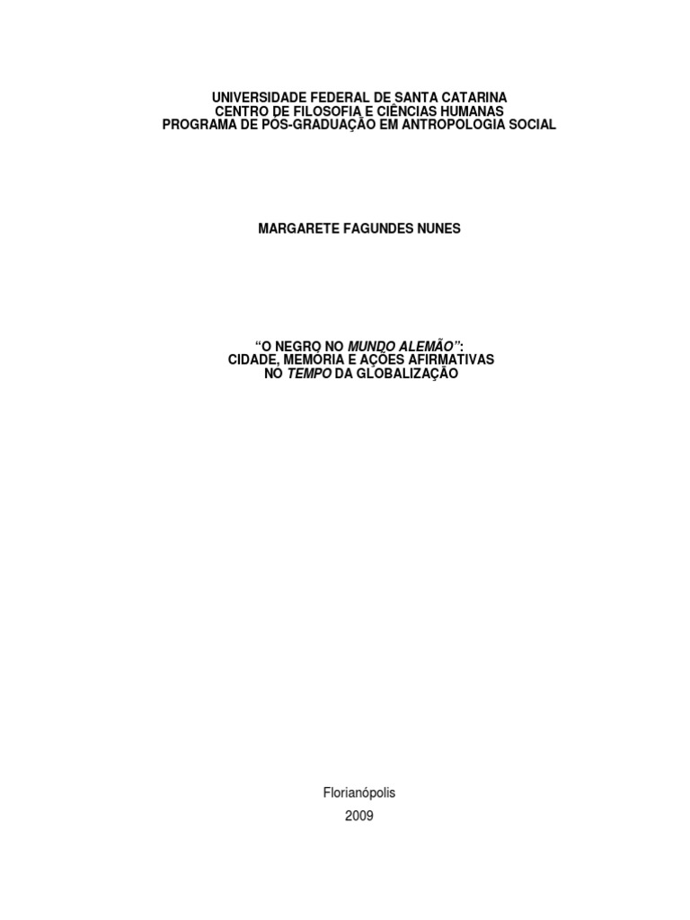 Nunes, Margarete Fagundes “O negro no mundo alemão”: cidade, memória e ações afirmativas no tempo da globalização / Margarete Fagundes Nunes ; orientadora Carmen Silvia Rial ; co-orientadora Ana Luiza Carvalho da Rocha. – Florianópolis, 2009.