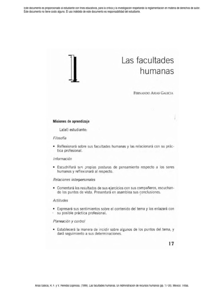 Arias Galicia, R. F. y V. Heredia Espinosa. (1999). Las facultades humanas. En Adminstracin de recursos humanos (pp. 17-30). Mxico: Trillas.