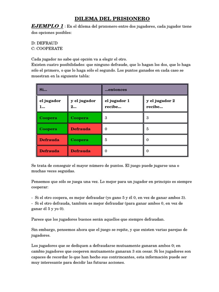 como el 'dilema de los presos', si los agentes actan buscando de forma racional su nico y