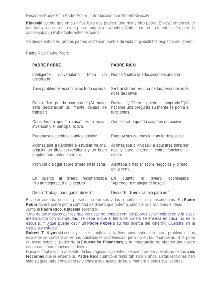 una vida de xito. Su Padre rico tambin le ense, la importancia de lo que hoy en da se