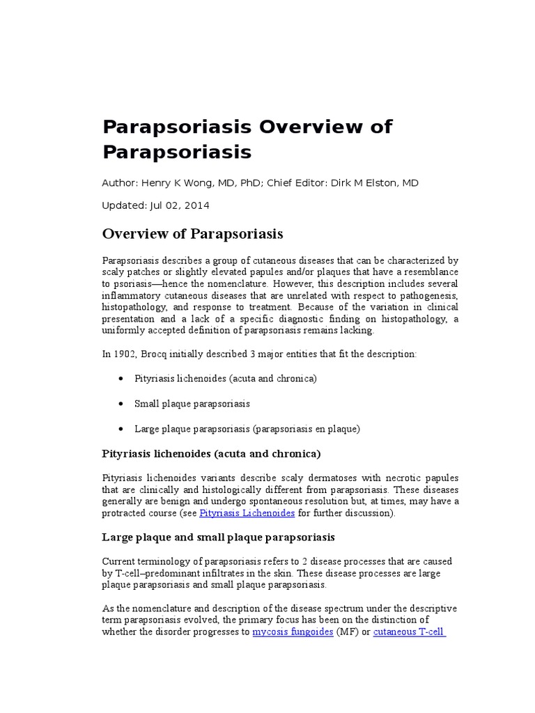 parapsoriasis. J Eur Acad Dermatol Venereol. 2006 Aug. 20(7):882-3.