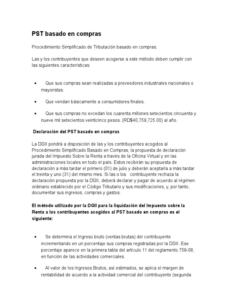 Renta a los contribuyentes acogidos al PST basado en compras es el