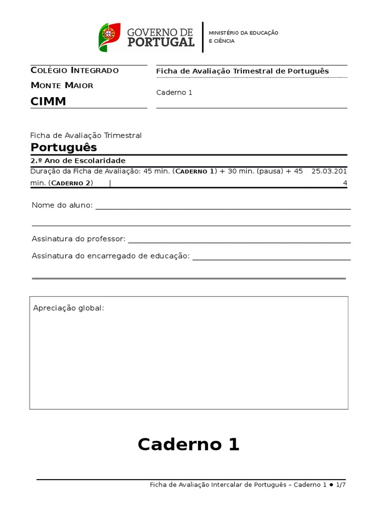 Ficha de Avaliao Intercalar de Portugus Caderno 1
